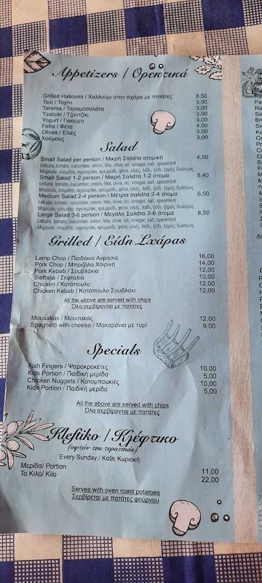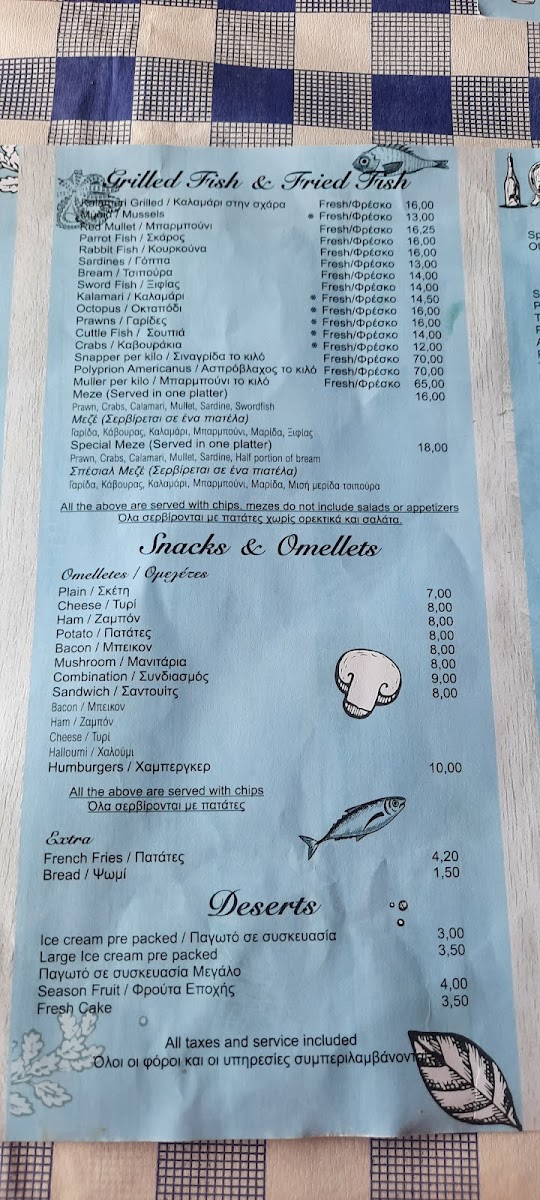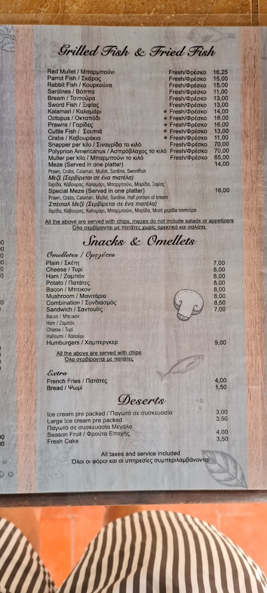 If you're in the mood for a more substantial meal, the Burger is a hearty choice, while the Grilled Squid remains a popular option for seafood enthusiasts. The Greek Salad is a fresh, zesty side dish that complements the rich flavors of the grilled seafood and meats. For a truly authentic experience, try the Octopus and Red Mullet, a combination that highlights the best of Cypriot cuisine. The Grilled Bream is another excellent seafood option, with a tender texture and subtle flavors that are perfectly enhanced by grilling.