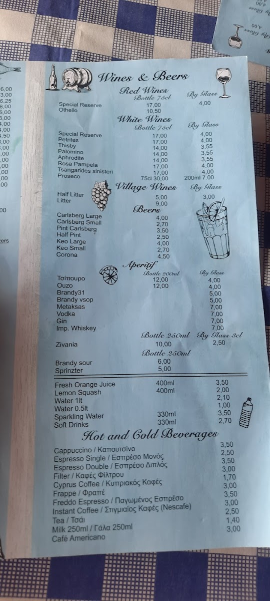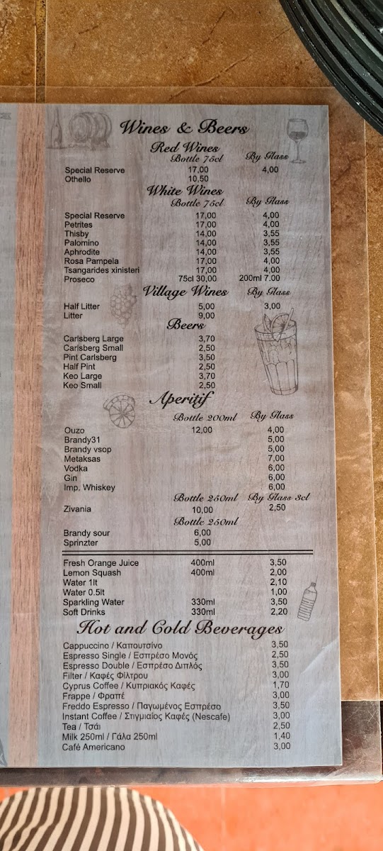 The drinks menu is just as impressive, with refreshing Cold Beers and freshly squeezed Orange Juice. The Cyprus Coffee, brewed on hot sand, offers a unique and aromatic experience. Additionally, the Cypriot Coffee Brewed on Hot Sand is a must-try for coffee aficionados looking for something traditional and strong. The meal is often complemented by Dips and Bread, a satisfying appetizer that pairs well with many of the dishes. Grilled Bread with Olive Oil and Oregano adds a simple yet flavorful touch to any meal, while Watermelon for Free provides a refreshing and sweet end to the meal. For a more wholesome option, the Village Salads offer a fresh, hearty choice for a light meal or side.